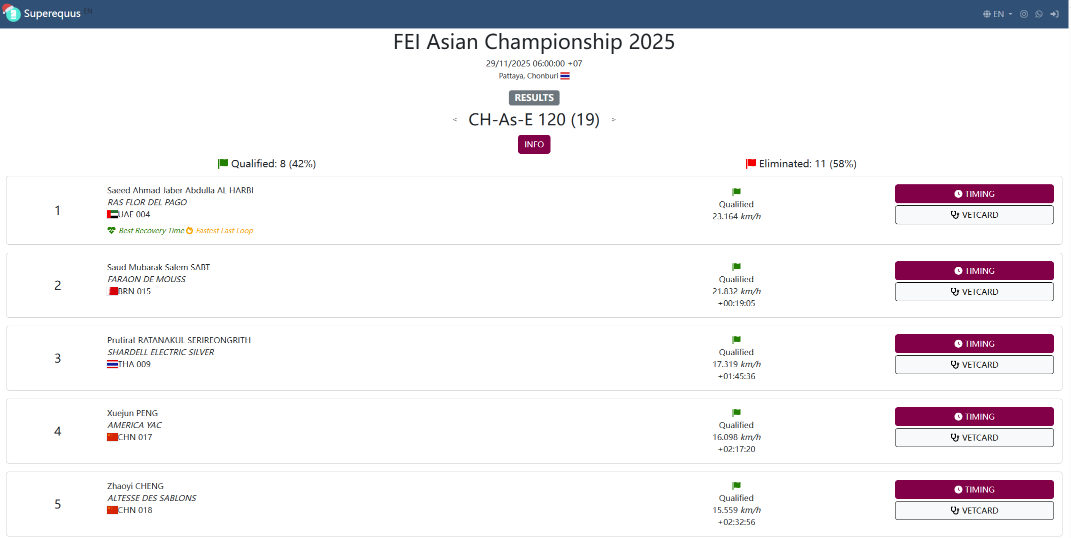 2025年11月29日,亞洲錦標(biāo)賽耐力賽在泰國芭提雅舉行,共有19對人馬參賽,其中8對順利完賽。中國隊彭學(xué)軍搭檔馬匹 America Yac、成昭毅搭檔馬匹 Altesse des Sablons 順利完成全部賽段比賽。何毅搭檔馬匹 Al Ral 在最后一程因代謝性原因被淘汰。最終,中國隊彭學(xué)軍、成昭毅分獲比賽第四、第五名。本次比賽個人冠軍由阿聯(lián)酋隊獲得,巴林和泰國選手分列第二、第三。
