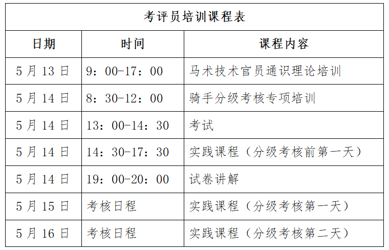 根據(jù)考評員培訓(xùn)計劃,我協(xié)會將于2021年5月13日-16日在北京市縱橫馬術(shù)學(xué)院(順義店)舉辦考評員培訓(xùn)活動,合格者授予相應(yīng)等級考評員證書?,F(xiàn)就本次培訓(xùn)考核相關(guān)事宜通知如下: