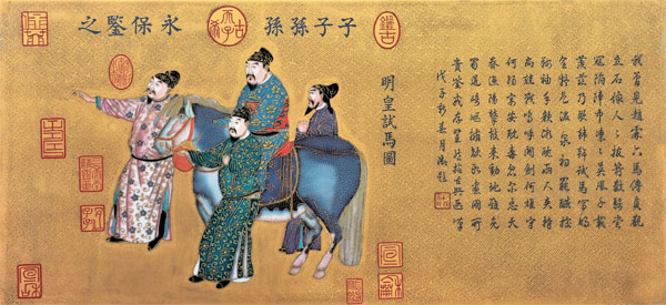 琺瑯瓷版畫(huà)《明皇試馬圖》根據(jù)清乾隆黑漆描金《明皇試馬圖》掛屏(清宮舊藏現(xiàn)存于故宮博物院)所制作,原作為唐代畫(huà)家韓干所畫(huà),作品中的人物形象及馬的神態(tài)刻畫(huà)的惟妙惟肖、入木三分,猶如神來(lái)之筆。