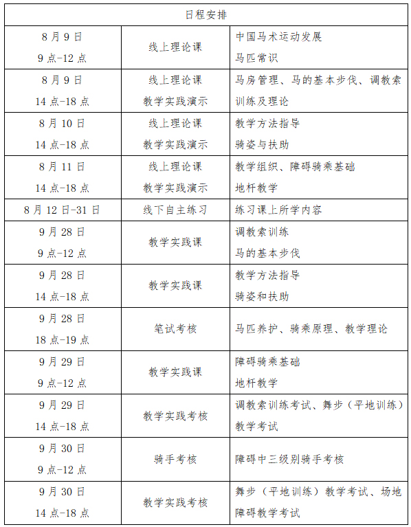 (三)線下輔導(dǎo)和實(shí)踐考核:2021年9月28日-9月30日,在上海市馬術(shù)運(yùn)動(dòng)管理中心進(jìn)行線下集中輔導(dǎo)與實(shí)踐考核。