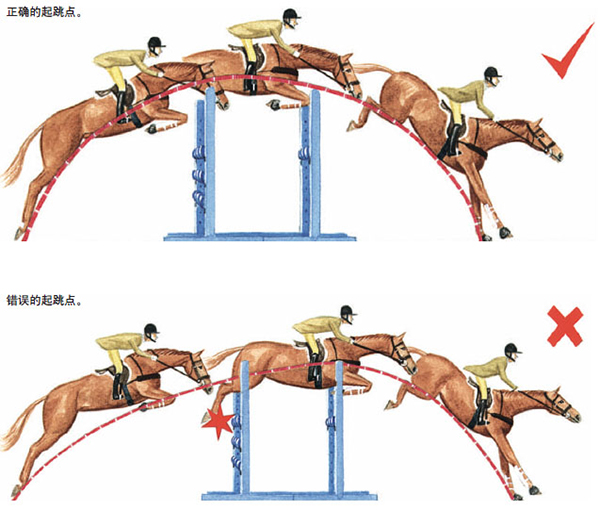 除非馬匹正確地接近障礙,否則馬匹不能夠調(diào)整其步伐以正確地找到起跳點。只有馬匹節(jié)奏、平衡和動力很好,它才能夠在伸長和縮短步伐時仍然不打桿。雙橫木障礙的起跳點的范圍比梯形障礙的起跳點要求更準(zhǔn)確,這樣就增加了跳障礙的難度。