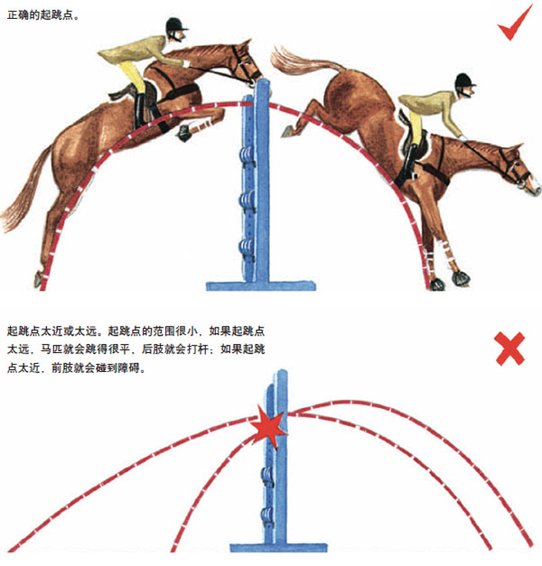 我們要記住馬匹是不喜歡打到障礙的,它們碰掉障礙通常都是騎手帶它們進障礙進得不好。重要的是,騎手們在接近障礙時不要為盡力讓馬干凈地越過障礙而緊張。不要試圖去拉馬起跳,這樣會令馬匹背部凹陷,沒有很好的拋物線,馬匹就一定會打桿。同樣的,在接近障礙時如果讓馬收縮得太多,會令馬失去節(jié)奏,也會跳越失敗。