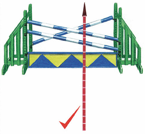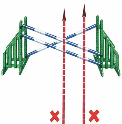 跳這樣的障礙可以不從障礙中間跳越,你要選擇的進障礙路線是在前面那根較低而后面那根較高的那條線上,而不是找像雙橫木一樣高的那條線上。比如說:前面的那根桿左邊很高,如果你從這里進障礙,那后面那根桿子就會比前面那根低,如果你選擇從中間跳,馬匹的左前腿就會很危險地撞到前面那根桿斜著的角度上。馬匹前腿打落這種障礙的機會通常比后腿要大。所以你要找一條線在中間略微偏右,雖然在這個點上后面那根桿會略高一些,但馬匹更容易跳得干凈。因為它會前腿收得很緊去用力跳越后面那根較高的桿子,注意一定不要讓馬塌腰,它的拋物線就會很好,后肢也就不會打桿。