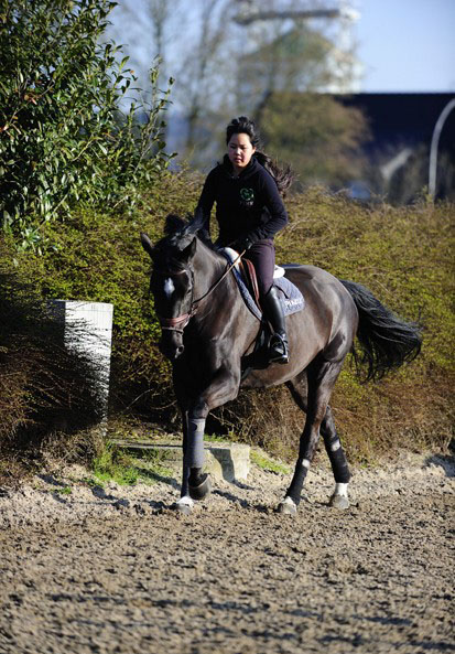若想讓馬匹將頭部抬到盡可能高的位置,騎手首先需要馬匹去完全地自我承重。在快步或跑步的時(shí)候,讓馬匹縮短步伐,但同時(shí)保持住推進(jìn)力。當(dāng)你感覺(jué)到它后肢穩(wěn)健了,試著讓它的一條前腿朝上抬起。同時(shí),騎手也要稍稍給韁并且雙手抬高,從而鼓勵(lì)馬匹按著你的指示把頭部也隨之抬高。
