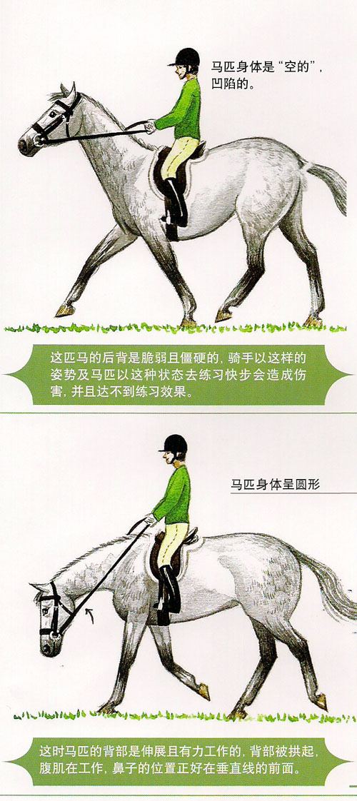 看這兩個(gè)圖例,注意這兩匹馬的背部和肚子的外輪廓線有什么不同,第一匹馬的背部是下沉的(凹陷的),腹肌虛弱,不結(jié)實(shí)(人類也一樣)?,F(xiàn)在來分析第二匹馬,這匹馬的背部是向上拱的,并且在用腹肌(肚子)工作。