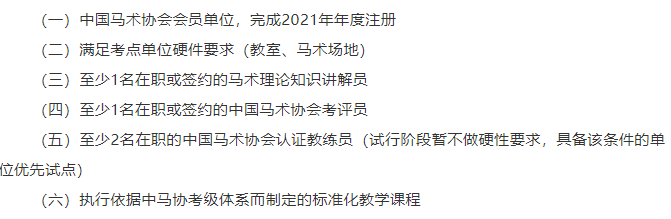 近日,中國(guó)馬術(shù)協(xié)會(huì)發(fā)布中馬協(xié)字〔2021〕218號(hào)《中馬協(xié)關(guān)于公開(kāi)招選基礎(chǔ)級(jí)考核試點(diǎn)單位的通知》,試點(diǎn)推進(jìn)基礎(chǔ)級(jí)考核工作,公開(kāi)招選中馬協(xié)基礎(chǔ)級(jí)考核試點(diǎn)單位。其中資質(zhì)要求第五條闡明需要至少2名在職的中國(guó)馬術(shù)協(xié)會(huì)認(rèn)證教練員,具備該條件的單位將優(yōu)先作為試點(diǎn)。此次基礎(chǔ)級(jí)考核試點(diǎn)單位招選,將探索中馬協(xié)考級(jí)體系與俱樂(lè)部教學(xué)融合發(fā)展,促進(jìn)俱樂(lè)部基礎(chǔ)教學(xué)體系化與規(guī)范化。同時(shí)資質(zhì)要求與中國(guó)馬術(shù)協(xié)會(huì)認(rèn)證教練員掛鉤,對(duì)于俱樂(lè)部和學(xué)員,擁有中馬協(xié)認(rèn)證的教練員身份愈發(fā)重要且必要。