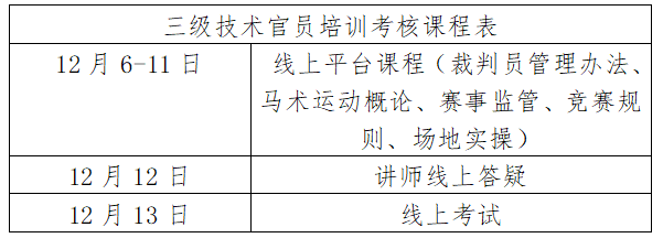根據(jù)馬術(shù)專業(yè)人才培養(yǎng)計(jì)劃,我協(xié)會(huì)將于2021年12月6日-13日在線上舉辦馬術(shù)場地障礙項(xiàng)目三級技術(shù)官員培訓(xùn)考核活動(dòng),合格者授予中國馬術(shù)協(xié)會(huì)相應(yīng)等級技術(shù)官員證。現(xiàn)就本次培訓(xùn)考核相關(guān)事宜通知如下: