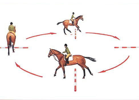 將4根地桿放在一個直徑為20米圓圈的4個等分點的地面上,讓馬先快步跨越地桿,然后再跑步跨越。