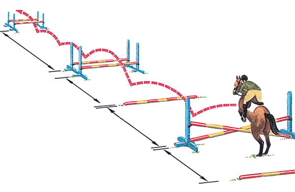 同其他復(fù)合障礙一樣,這個(gè)訓(xùn)練從應(yīng)用很小的障礙開(kāi)始,逐漸組合成大小適合騎手和馬匹訓(xùn)練水平的障礙。不要過(guò)分信任你的馬匹,很明顯在這個(gè)訓(xùn)練中最后一個(gè)比較大的障礙較容易跳越,因?yàn)樗O(shè)置的距離使馬匹能在正確位置起跳,不過(guò)也沒(méi)必要讓馬跳越一些更大的障礙欄。訓(xùn)練中一定要有一個(gè)有經(jīng)驗(yàn)的人在現(xiàn)場(chǎng)指導(dǎo),這將會(huì)幫助騎手避免發(fā)生危險(xiǎn)。