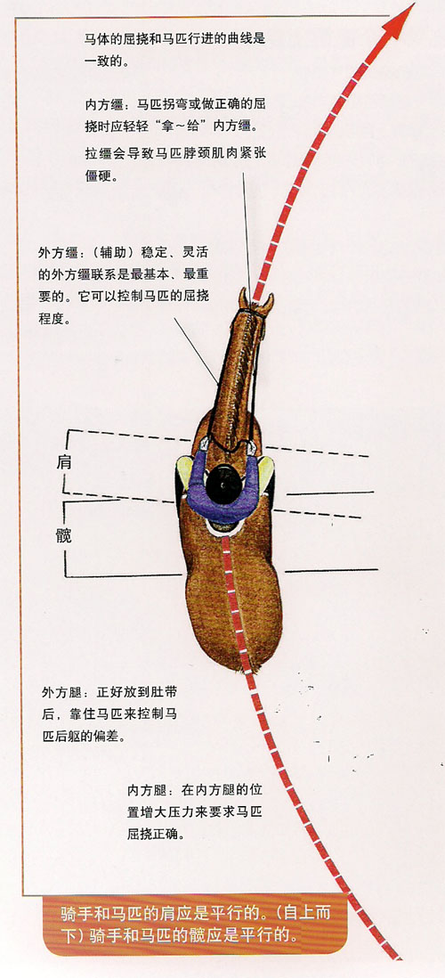 騎手應(yīng)完全理解經(jīng)常用到的術(shù)語,“內(nèi)方”、“外方”等。當(dāng)馬匹向右側(cè)行進(jìn)時(shí),術(shù)語“內(nèi)方”是指馬體的右側(cè),“外方”是指馬體的左側(cè)。騎手要求馬匹向內(nèi)側(cè)屈撓,身體沿著曲線移動(dòng)。如果圈程很大,馬匹的屈撓是輕微的;當(dāng)圈程縮小時(shí),屈撓明顯變大。同樣的,馬匹必須朝向轉(zhuǎn)彎的方向屈撓。