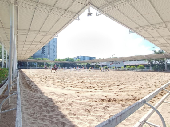 擁有1個60米×80米的正規(guī)賽事沙池、一個40米×40米訓(xùn)練沙池,以及3個直徑10米的圓形調(diào)教池,可滿足從啟蒙訓(xùn)練到專業(yè)障礙/舞步競技訓(xùn)練的全階段訓(xùn)練要求,60m×80m的室內(nèi)訓(xùn)練場于2022年建成,是目前廣州唯一配套最全、占地最大、可拓展空間最大的馬術(shù)培訓(xùn)基地。在確保滿足各種等級培訓(xùn)開展的同時,打造符合承辦各類國際高端馬術(shù)比賽的軟硬件條件的運動基地。