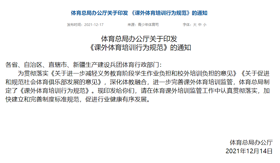 2021年底國家體育總局辦公廳正式印發(fā)了《課外體育培訓(xùn)行為規(guī)范》,旨在深化“雙減”政策下的體教融合,并進一步完善課外體育培訓(xùn)監(jiān)管。體育總局從課外體育培訓(xùn)場地設(shè)施要求、課程要求、從業(yè)人員要求、內(nèi)部管理要求、安全要求等多維度出發(fā),要求各省市體育局加強對體育課外培訓(xùn)的監(jiān)管工作,加快建立和完善制度標(biāo)準(zhǔn)規(guī)范,促進行業(yè)健康有序發(fā)展。