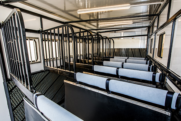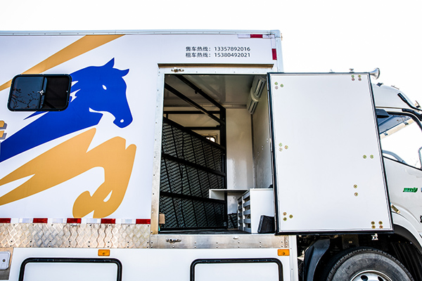 車輛的后半部分容納有運(yùn)馬的空間,每匹馬中間有擋板分割開來,馬匹接觸面均有軟包設(shè)計(jì),貼心呵護(hù)馬匹安全,該車能運(yùn)輸六匹馬,廂體內(nèi)部循環(huán)通風(fēng)設(shè)計(jì),內(nèi)部安裝有空調(diào)、照明、消毒燈等等設(shè)施,保證賽馬能夠舒適的通勤,避免受傷或是生病,影響比賽表現(xiàn)。