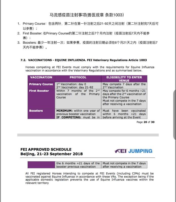 (六)各參賽運動員自帶馬匹參賽,馬匹必須至少年滿7歲(2015年1月1日前出生)。參賽馬匹須具有中國馬術協(xié)會頒發(fā)的馬匹護照,并在到達賽區(qū)后及時向賽會獸醫(yī)提交。參賽馬匹在賽前按規(guī)則要求進行驗馬,未參加驗馬的馬匹不得參加比賽;