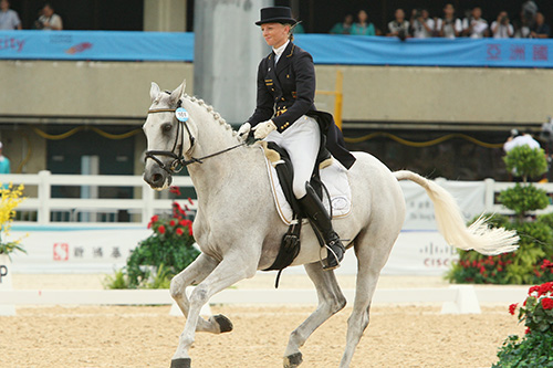 從上面的圖片可以看出,馬和騎手非常專注。馬匹看起來非常柔軟,對騎手的輔助也非常服從。從馬四肢可以看出,馬匹的步伐充滿彈性;再去看到馬的臀部,有旋轉的動勢,說明馬的背部靈活柔軟。也可以看出這是一匹年輕馬,因為它的肌肉還沒有像成熟舞步馬那樣圓、發(fā)達,但是作為一匹年輕馬,它的運動方式,頭和頸部的位置非常好。