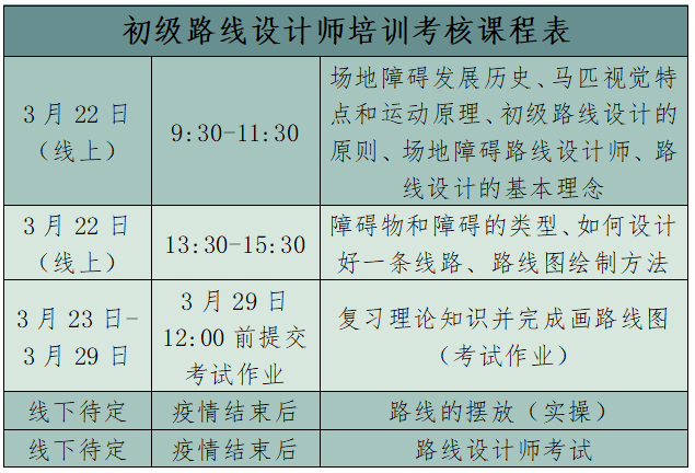 (三)具備中三級場地障礙騎手等級證書,或一星級教練員證書。如無相應級別證書,可在通過本次培訓考核一年內取得相應證書換取初級路線設計師證書。