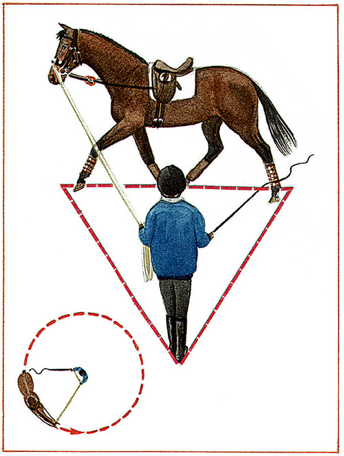 讓馬的步伐向前,自己的身體位置要更多朝向馬后軀,如果想讓馬停下來,走到與馬匹平行或在馬眼睛前方的位置。當它走得很好時,就選用一個與肚帶平行的位置。你是這三角形的頂端,馬是底部,鞭子和調(diào)教索是兩邊。