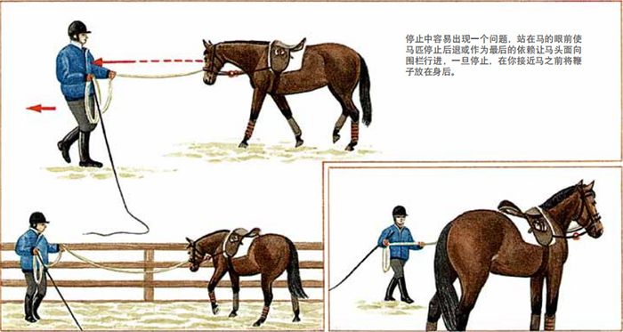右手握鞭及調(diào)教索圈。與馬匹肩部水平站位,鞭子指向馬匹后蹄,告訴馬“WALK-ON慢步”。你的左手手指必須允許調(diào)教索隨著馬匹慢步向前滑動(dòng),從而走成圈蹄跡線,慢步到馬匹進(jìn)入了圈蹄跡線,并用鞭子輕輕促使馬保持步伐向前,一旦馬匹行進(jìn)到圈蹄跡線里,你可以要求馬做“快步”。讓馬盡可能地走大圈。練習(xí)一些快步帶慢步,快步到停止的變換,之后向前再變成快步。決不能允許馬匹轉(zhuǎn)向你所站的方向。一旦你感到左邊已控制好,讓馬停下來然后換到右邊。確保調(diào)教索卷繞正確。多數(shù)馬匹在右邊行進(jìn)時(shí)不太敏感,并且總試著對(duì)著你。向馬匹的后軀方向移動(dòng),但也不要太過接近,以防止馬后踢。讓馬匹步伐向前,確保利用調(diào)教索引導(dǎo)馬匹向前。如果馬匹在左右兩個(gè)方向都能夠放松行進(jìn)時(shí),就系上側(cè)韁,以幫助馬匹用正確的外形姿態(tài)工作。這樣做有利于馬匹肌肉的發(fā)展及行進(jìn)方式。先將側(cè)韁系在右側(cè),這樣的話,即使馬匹逃脫,仍可給予更多的控制。利用步伐變換及頻繁的換方向進(jìn)行練習(xí)。