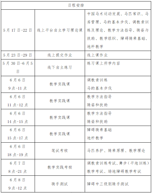 (三)線下輔導(dǎo)和實(shí)踐考核:2022年6月6-8日,在云南金輝馬術(shù)俱樂部進(jìn)行線下集中輔導(dǎo)與實(shí)踐考核。