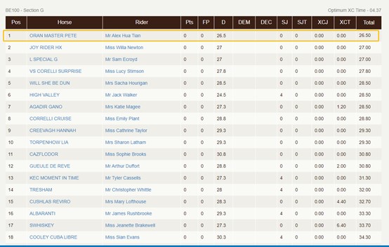 在37對(duì)參賽人馬組合中,華天搭檔馬匹ORAN MASTER PETE取得了越野和障礙比賽的零罰分,最終以舞步得分73.5的優(yōu)秀成績(jī)奪得比賽冠軍。