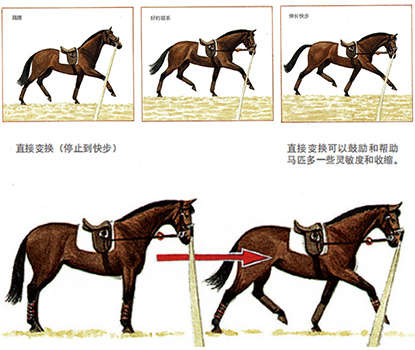 這里最普遍的問題是馬匹也許會(huì)變得過度興奮。如這種情況發(fā)生,就要使馬匹再做快步并要等待馬匹安靜下來后,再重試。你能通過在圈線上開展這項(xiàng)工作來要求步伐伸長(zhǎng)。