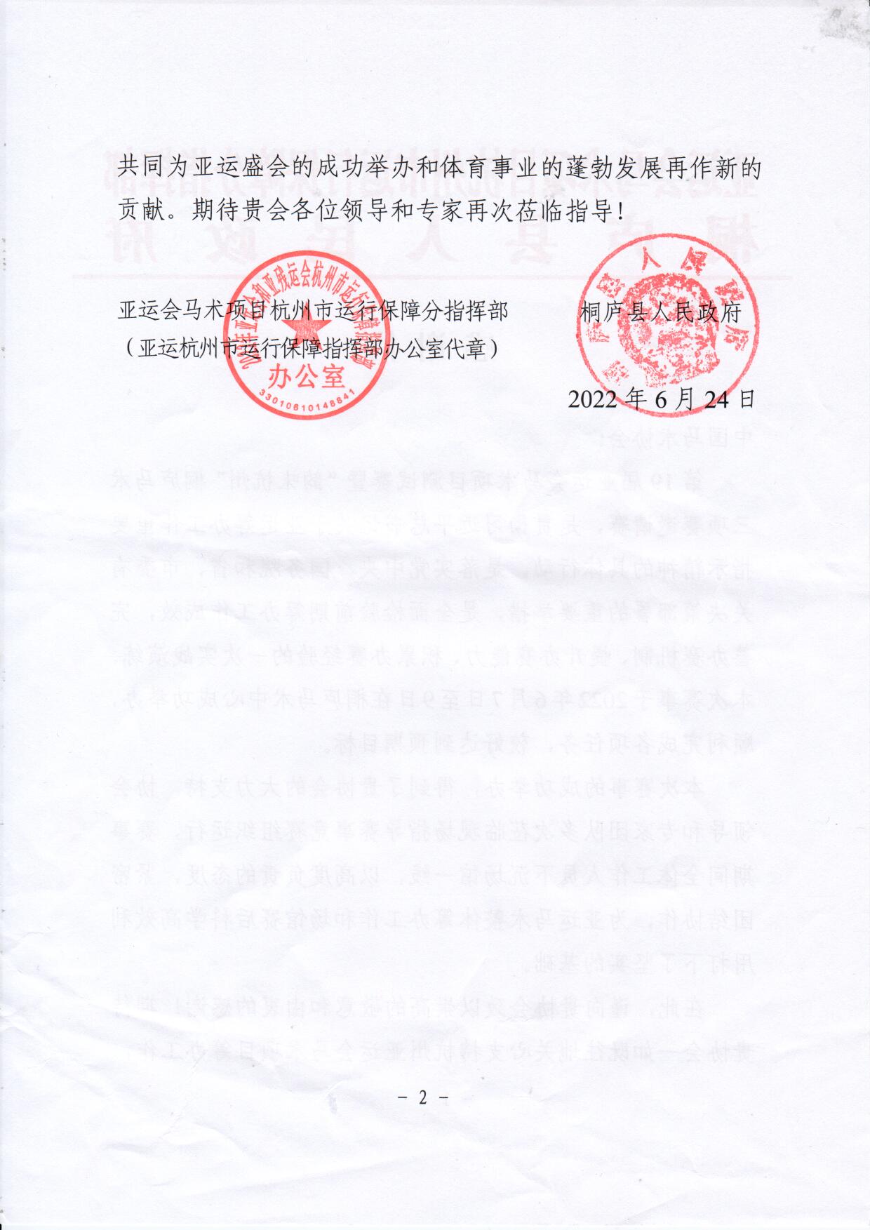 亞運會馬術(shù)項目杭州市運行保障分指揮部、桐廬縣人民政府致謝中國馬術(shù)協(xié)會