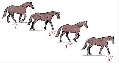 慢步(walk)又叫常步,是馬行走的基本方式,是四節(jié)拍(蹄音)步伐,踏蹄的順序為:右后——右前——左后——左前。速度為3-4英里/小時。