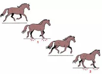 跑步是三節(jié)拍(蹄音)步伐,以左跑步為例,踏蹄的順序為:右后——左后、右前——左前——騰空期;以右跑步為例,蹄音的順序是:左后肢、左對角肢(左前肢和右后肢同時動作),右前肢,隨后是瞬間的騰空期,在跑下一步之前,四蹄全部騰空。速度為:8-10英里/小時。