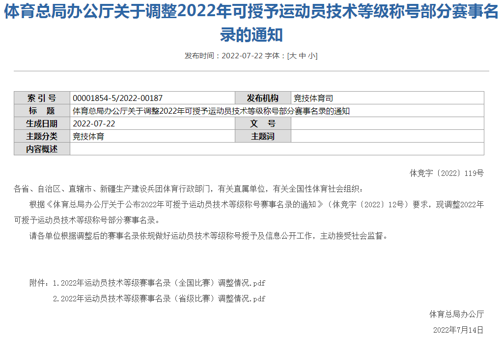 近日,國家體育總局在官網(wǎng)上發(fā)布了《體育總局辦公廳關(guān)于調(diào)整2022年可授予運動員技術(shù)等級稱號部分賽事名錄的通知》。通知調(diào)整了2022年可授予運動員技術(shù)等級稱號部分賽事名錄,各單位根據(jù)調(diào)整后的賽事名錄依規(guī)做好運動員技術(shù)等級稱號授予及信息公開工作,主動接受社會監(jiān)督。
