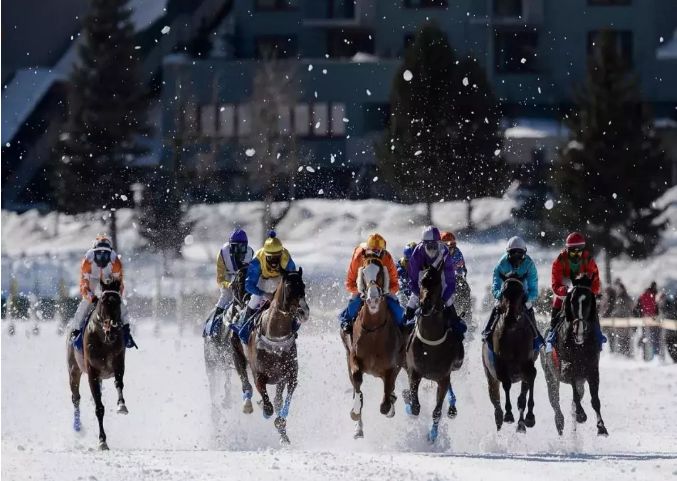 瑞士的雪上賽馬大會每年都會在圣莫里茲冰封的湖面上舉辦。最具特色的項目正是被稱為“恩嘎丁之王”的雪地賽馬,比賽要求參賽者坐在雪橇上,由純種賽馬拉著,以高達50每小時公里的速度行駛2700米,這也是雪上賽馬大會所獨有的比賽項目。