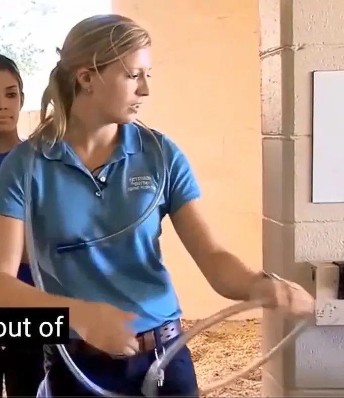 (4)當(dāng)?shù)竭_(dá)第二處標(biāo)示時,在導(dǎo)管起始端吸氣。檢測是否為負(fù)壓,也可以嗅聞導(dǎo)管中 是否傳來苜蓿草或飼料氣味,這些跡象表明導(dǎo)管進入了胃部。右手時刻緊扣,防止導(dǎo)管滑動。也可以用膠布等固定導(dǎo)管。