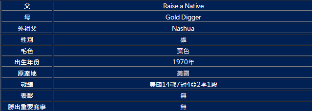 “淘金者”(Mr.Prospector)之父Raise a Native是成功種馬,其母Gold Digger出自馬王Nashua,此優(yōu)秀的血統(tǒng)令其于周歲時(shí)在昆士蘭7月周歲馬拍賣會(huì)中以全場(chǎng)最高價(jià)(220,000美元)出售。