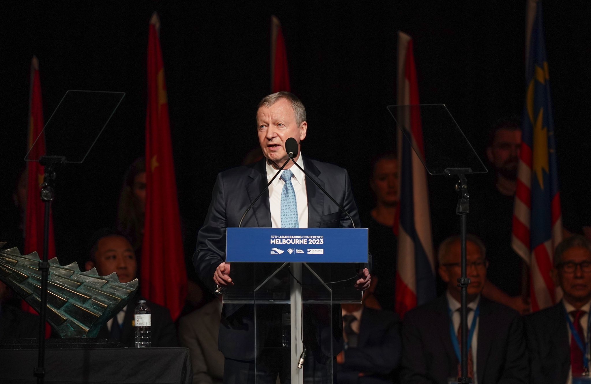 ▲國際賽馬聯(lián)盟組織主席、亞洲賽馬聯(lián)盟組織主席、香港賽馬會行政總裁應(yīng)家柏發(fā)表重要講話