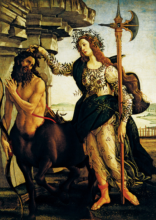 這幅作品深得波提切利自己的喜愛(ài)。他描繪了馬人與女神米諾娃(即雅典娜)在一起的形象,從畫(huà)中的馬人身上看不到一絲貪婪之氣。反之,這個(gè)半人半獸顯得十分溫柔、馴服,寓意智慧(米諾娃的象征意義)戰(zhàn)勝了野蠻。