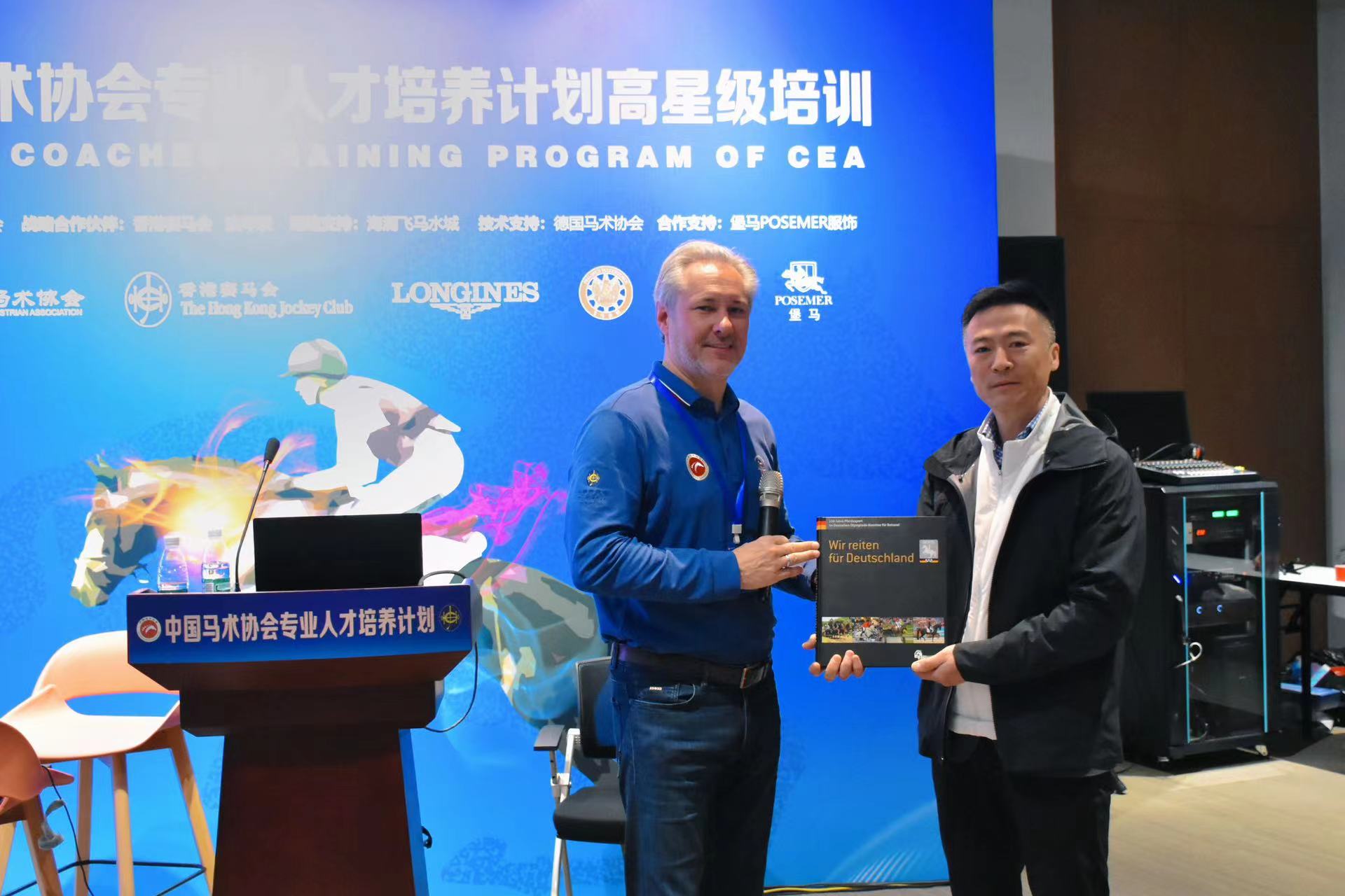在開課儀式上,德方領(lǐng)隊(duì)代表德國馬術(shù)協(xié)會(huì)秘書長(zhǎng)松克先生贈(zèng)予中國馬術(shù)協(xié)會(huì)秘書長(zhǎng)鐘國偉先生關(guān)于德國百年馬術(shù)史的著作,以此祝愿兩國在馬術(shù)交流上的友誼長(zhǎng)存。