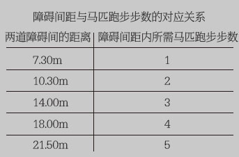 大約在距離第二賽季開始10個星期的時候,我們就應(yīng)該開始加大訓(xùn)練強(qiáng)度了,尤其是著重訓(xùn)練馬匹加快速度的能力。在提速訓(xùn)練中,我們讓馬匹跑步向前做單一組合障礙的跳躍。在此訓(xùn)練的初期,單一組合障礙要直線擺放,先不著急練習(xí)轉(zhuǎn)彎的技巧,轉(zhuǎn)彎是隨后的訓(xùn)練內(nèi)容。每道障礙間的距離同第一賽季訓(xùn)練時相同,但是馬匹要學(xué)會快速地跑步通過,不要加長步幅,馬匹跑步步數(shù)與障礙間距的對應(yīng)關(guān)系請見上表。