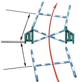 在拐彎處,擺一個(gè)交叉桿,在交叉桿的前后各放一個(gè)地桿,這樣的練習(xí)可以改進(jìn)馬匹以正確的腿著地。(如下圖)
