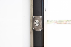 箱體后取消尾門采用牛力折疊式液壓尾板,自動(dòng)翻轉(zhuǎn)結(jié)構(gòu),并帶有無(wú)線遙控控制,馬擋板使用全鋁型材框架結(jié)構(gòu)。