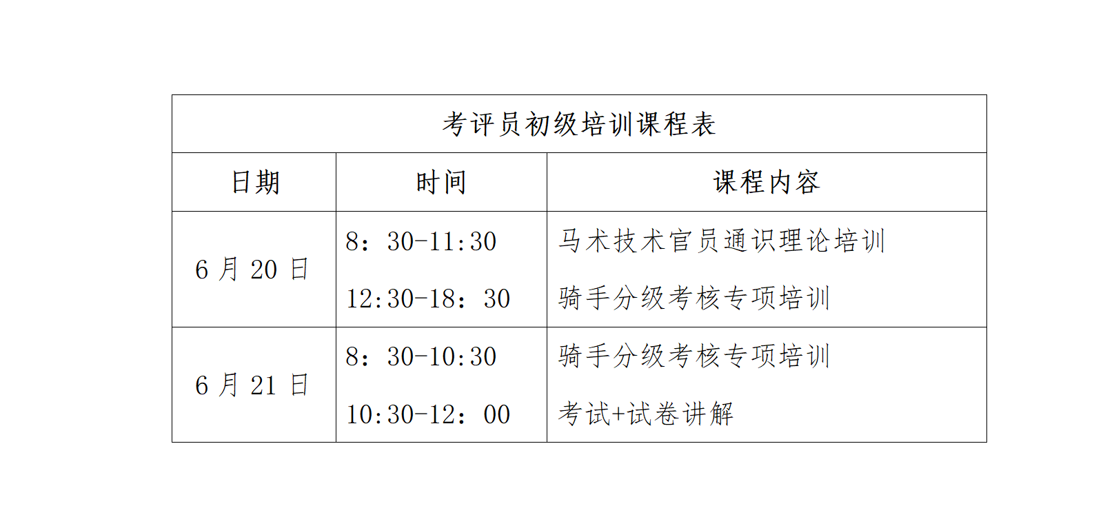 為進(jìn)一步推進(jìn)考評(píng)員人才隊(duì)伍建設(shè),規(guī)范考評(píng)員執(zhí)裁工作流程與標(biāo)準(zhǔn),我協(xié)會(huì)將于2023年6月20日-24日在江蘇省蘇州市世騎家旺山馬術(shù)俱樂(lè)部舉辦考評(píng)員培訓(xùn)活動(dòng),同期舉辦考評(píng)員2023年年度工作會(huì)議?,F(xiàn)就相關(guān)事宜通知如下: