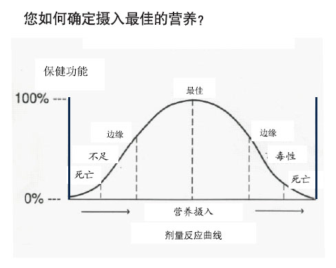 劑量反應(yīng)曲線的原理適用于所有馬匹飲食中。底線(或軸)從零開始隨著營(yíng)養(yǎng)的攝取量逐步增加。垂直線也從零開始延續(xù)至100%保健功能,表示在100%時(shí)您的馬感覺及功能完美。這個(gè)劑量反應(yīng)曲線顯示了自然法則, 沿著水平軸每個(gè)攝入的水平都有相應(yīng)保健功能的百分比。