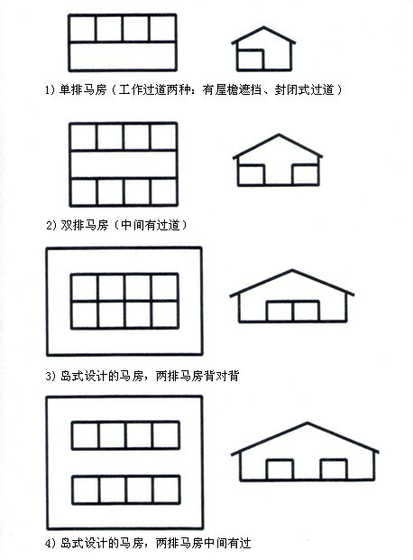 (1)馬廄肩并肩,兩排馬廄面對面,中間為寬過道。