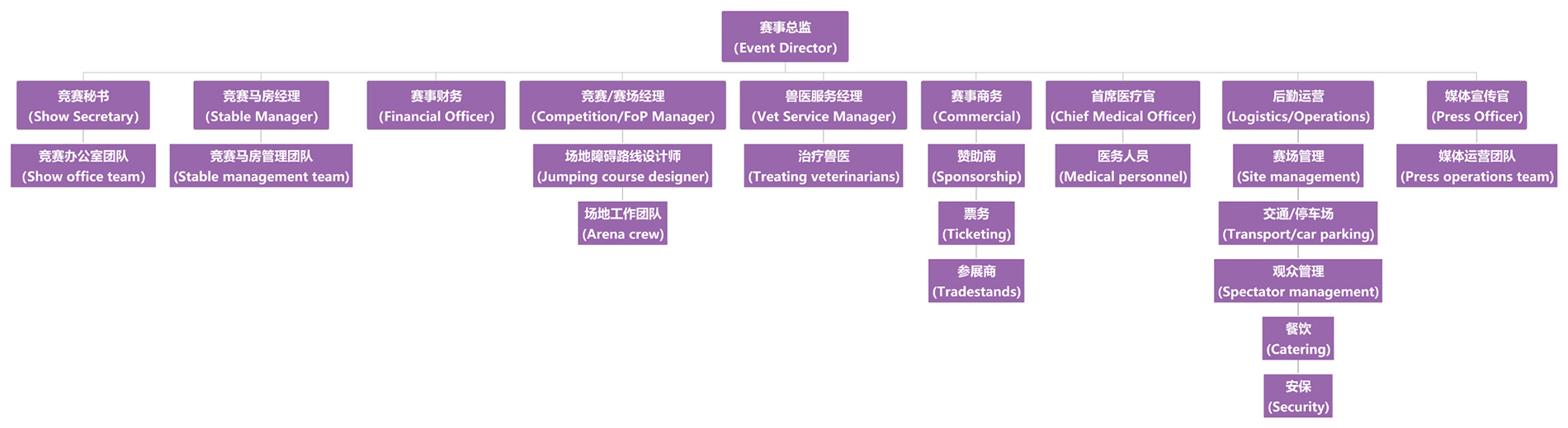 任何賽事,確定組委會部門和分工是非常重要的,因為整個組委會直接對賽事負責。這一點無論是什么賽事都一樣,馬術(shù)項目因為有動物參與的特殊性,所以與其他比賽所不同的地方在于組委會部門中有和馬息息相關(guān)的角色。一般情況下,組委會在賽事組織者或賽事總監(jiān)的領(lǐng)導下,會任命一些職業(yè)人分別負責賽事的各個方面,比如賽事秘書、競賽場地經(jīng)理等。此外,還有馬房經(jīng)理、獸醫(yī)服務經(jīng)理、首席醫(yī)師和一般的現(xiàn)場后勤或管理等。更大的賽事還會考慮任命相關(guān)人事來管理財務、營銷、新聞關(guān)系/傳播、贊助、接待、貿(mào)易和零售。