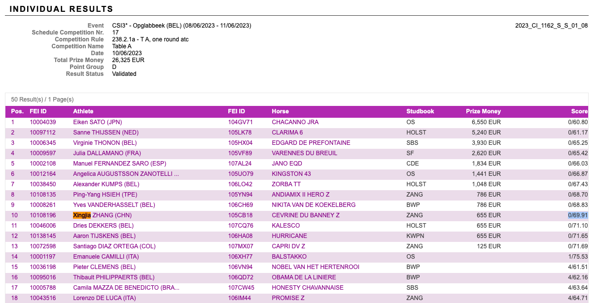 2023年6月15日,在比利時奧普赫拉貝克舉行的場地障礙賽CSI4* 150CM級別比賽中,張興嘉策騎馬匹Cevrine du Banney Z以4罰分78.41秒的成績順利完賽。