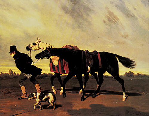 《賽馬歸來》這幅作品創(chuàng)作于1840年,德-德勒用幽默的繪畫語言描述了這個有趣的場景:一個男人正牽著兩匹賽馬剛從賽場往家里趕去?;丶衣飞希L(fēng)陣陣,男人用圍巾把嘴捂得嚴(yán)嚴(yán)實(shí)實(shí)。對于男人和他的賽馬來說,這肯定是難言成功的一天,就連陪他們一起回家的小狗身上也透露著濃濃的失望氣息。整幅作品筆調(diào)風(fēng)趣,色彩活潑,體現(xiàn)出作者對當(dāng)時社會細(xì)節(jié)的準(zhǔn)確捕捉以及對賽馬運(yùn)動的獨(dú)特趣味。(馬術(shù)雜志)