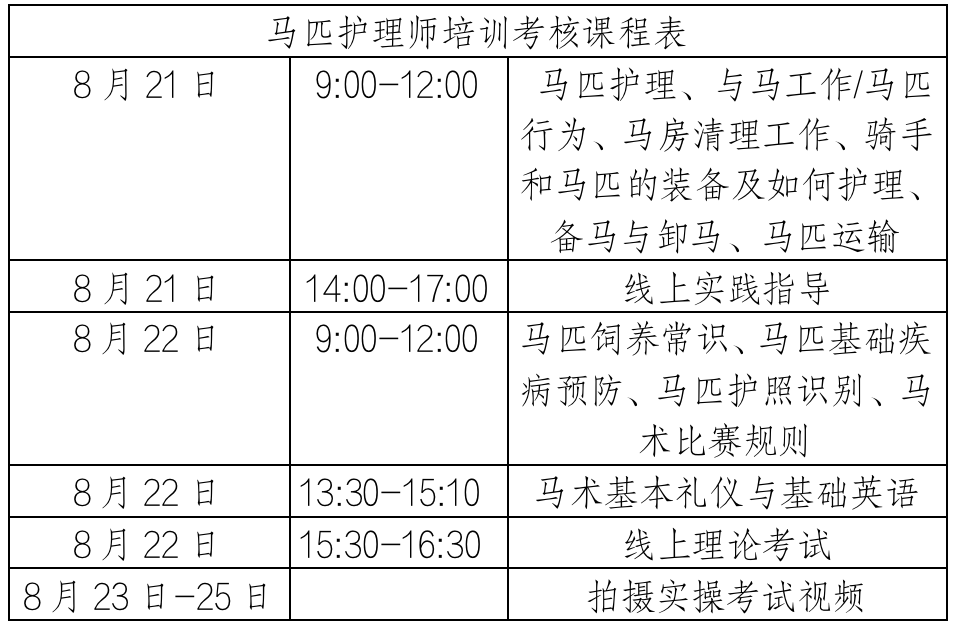 根據(jù)馬術(shù)專業(yè)人才培養(yǎng)計(jì)劃,我協(xié)會(huì)將于2023年8月21日-22日在線上舉辦馬匹護(hù)理師培訓(xùn)考核活動(dòng),合格者授予中國馬術(shù)協(xié)會(huì)相應(yīng)等級(jí)馬匹護(hù)理師證?,F(xiàn)就本次培訓(xùn)考核相關(guān)事宜通知如下:
