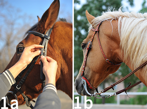 首先,把頰革調(diào)松以使得銜鐵可以自然舒服地下垂在馬的口中。然后依次調(diào)整兩邊頰革的長度,每次移動一孔的大小直到將銜鐵調(diào)到正確的位置——通常銜鐵會隱約接觸馬的口角,但不會讓口角形成過多的褶皺。為了保證水勒的平衡和對稱,再檢查一下兩邊頰革的長短是否一致、兩邊的扣帶是否扣在相同位置的孔中了。雖然西部水勒【1a】比英式水勒【1b】少了些扣帶,但是調(diào)整方法是相似的。