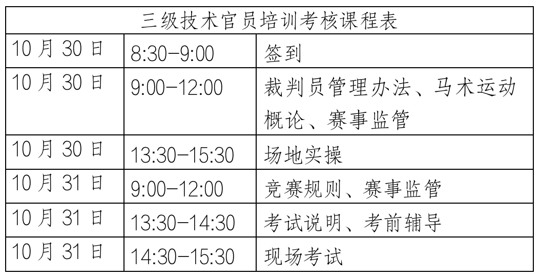 根據(jù)馬術專業(yè)人才培養(yǎng)計劃,我協(xié)會將與臨沂市馬術運動協(xié)會于2023年10月30日-31日在豐和馬術俱樂部舉辦馬術場地障礙三級技術官員培訓考核活動,合格者授予中國馬術協(xié)會相應等級技術官員證?,F(xiàn)就本次培訓考核相關事宜通知如下:
