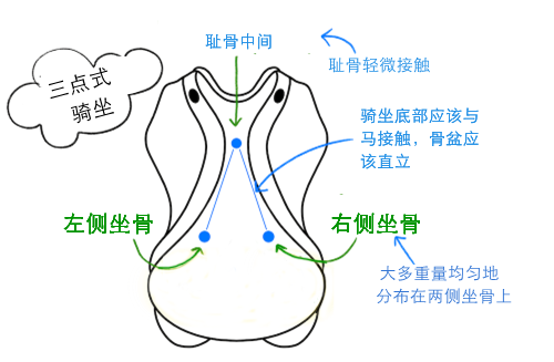 三點(diǎn)式騎坐是由你的坐骨和恥骨組成的。你應(yīng)該讓自己大部分的重量均勻地分布在兩側(cè)坐骨上,同時(shí),恥骨與馬鞍保持輕微的接觸。騎坐底部應(yīng)該與馬接觸,骨盆應(yīng)該直立。