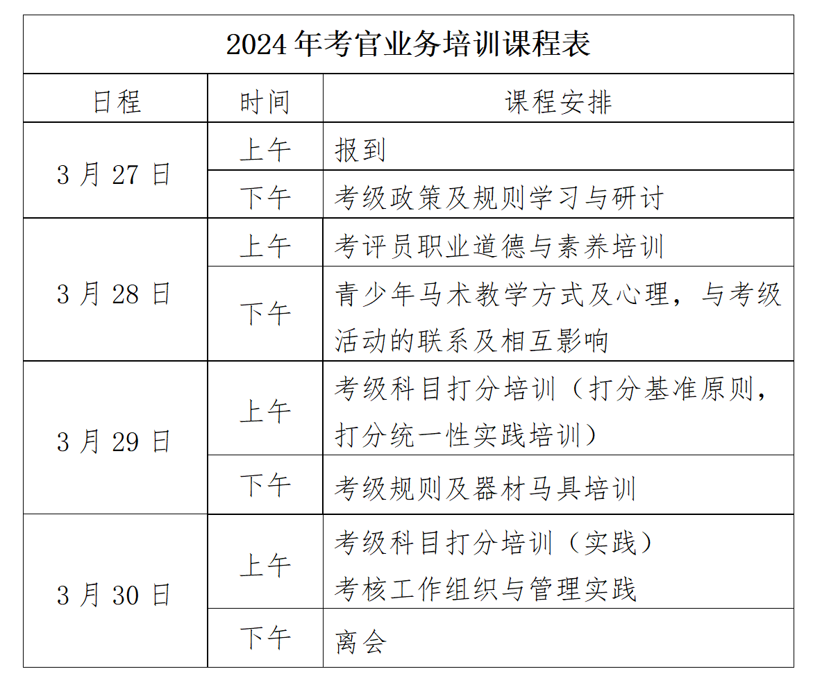 我協(xié)會(huì)將于2024年3月27日到30日在上海市愛(ài)久馬術(shù)俱樂(lè)部舉辦考官業(yè)務(wù)培訓(xùn)活動(dòng)?,F(xiàn)就本次培訓(xùn)考核相關(guān)事宜通知如下:
