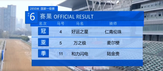 第六場“同進(jìn)杯”4歲中國出生純血馬2850米賽事,最終來自馬主閆立新名下“好運(yùn)之星”贏得末戰(zhàn);六場賽事精彩紛呈,讓現(xiàn)場觀眾激動(dòng)歡呼!